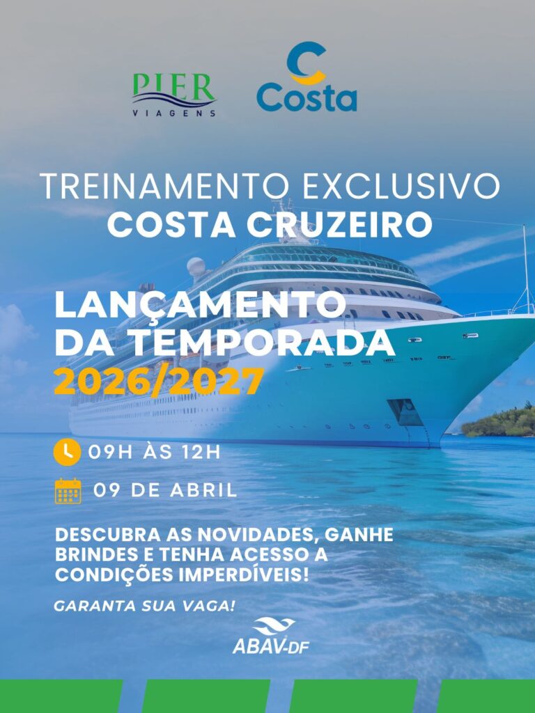 A ABAV-DF, em parceria com a Pier Viagens e a Costa Cruzeiros, promove um treinamento exclusivo voltado para agentes de viagens que desejam se destacar no segmento de cruzeiros marítimos.